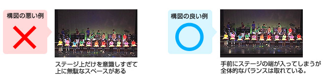 左の画像は、ステージの下端を隠すために、全体的に構図を下げてしまっていますが、その分、上に無駄なスペースができてバランスの悪い構図になっています。右の画像は、手前にステージの端が写りこんでいますが、全体的なバランスは取れています。